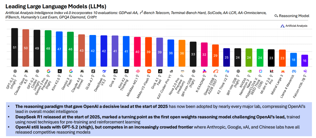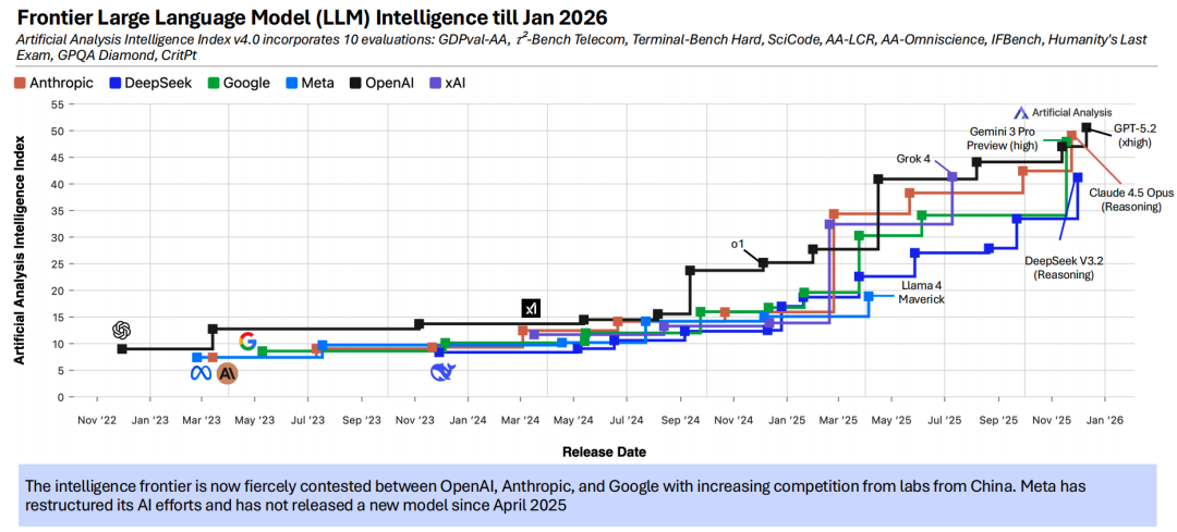 1、截至 2025 年底,OpenAI、xAI 与 Anthropic 三家公司凭借最新推理模型,在前沿智能领域占据领先地位,与其他 AI 实验室拉开了明显差距。