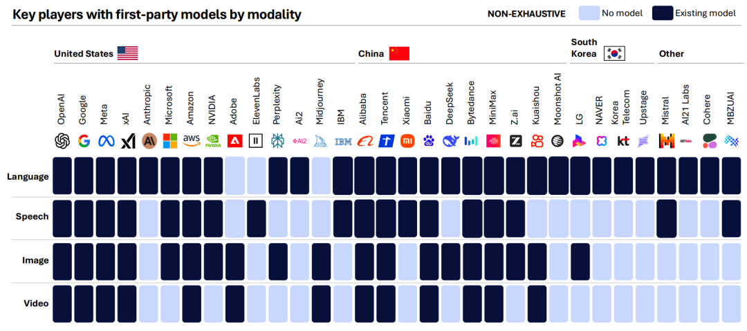 不过,前沿能力仍集中在美中两国的头部公司手中:美国有 OpenAI、Anthropic、Google,中国则是 Moonshot AI、Z.ai、DeepSeek、Minimax。