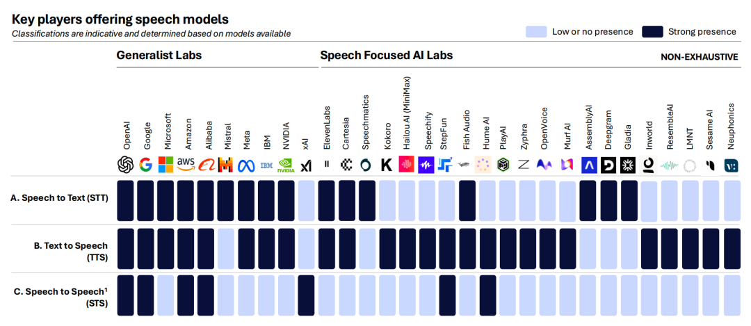 6、虽然通用 AI 实验室(比如 OpenAI、谷歌)的产品覆盖了所有语音模态,但纯语音 AI 实验室的专注度更高,尤其是在文本转语音领域。