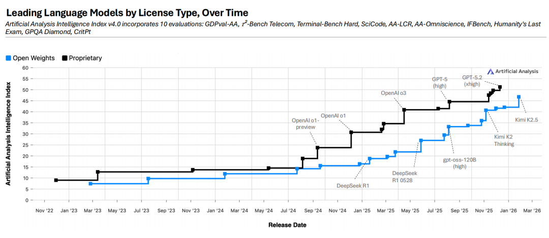 另一方面,2025 年全年,开源权重模型大体上跟上了专有模型的发展节奏,但专有模型在整体智能水平上仍处于领先地位。