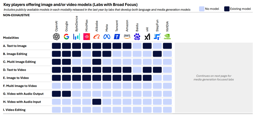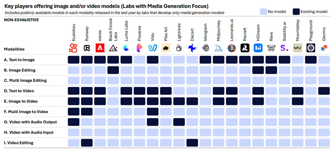 6、与语言模型领域不同,专注于媒体生成的小型 AI 实验室,仍能与那些拥有更广泛模态覆盖范围的大型实验室展开竞争。