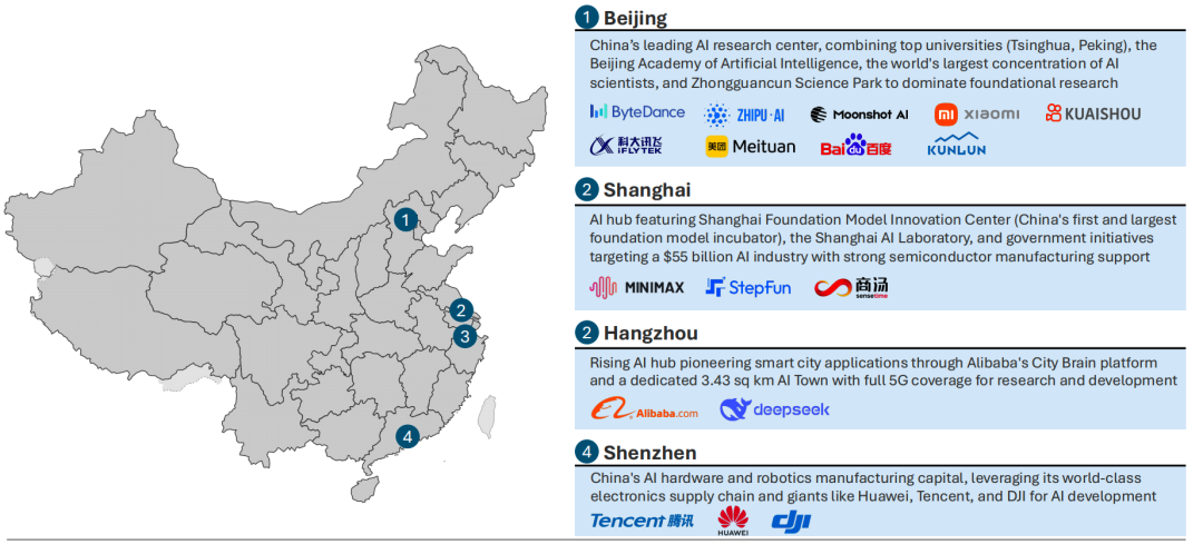 7、北京正崛起为前沿 AI 初创企业的活力中心,而成熟的科技巨头则地理分布更分散,不存在单一的技术创新枢纽。