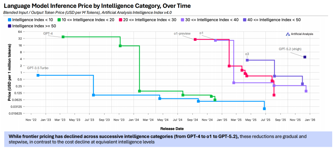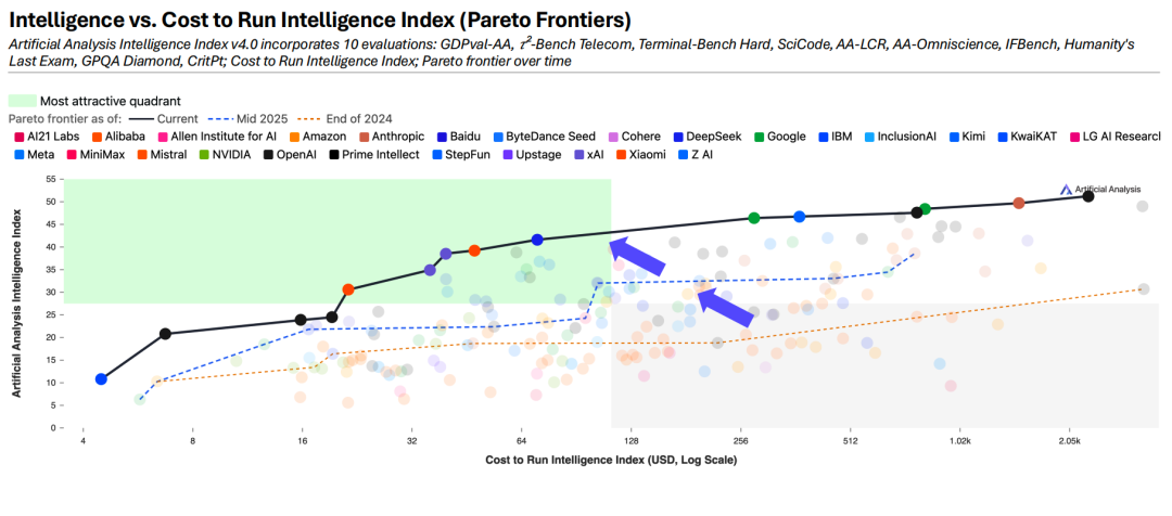 2、2025 年推出的 AI 模型刷新了智能与成本的平衡边界:企业现在要么能用相同预算获得更强大的智能,要么能以显著更低的成本获取同等水平的智能。