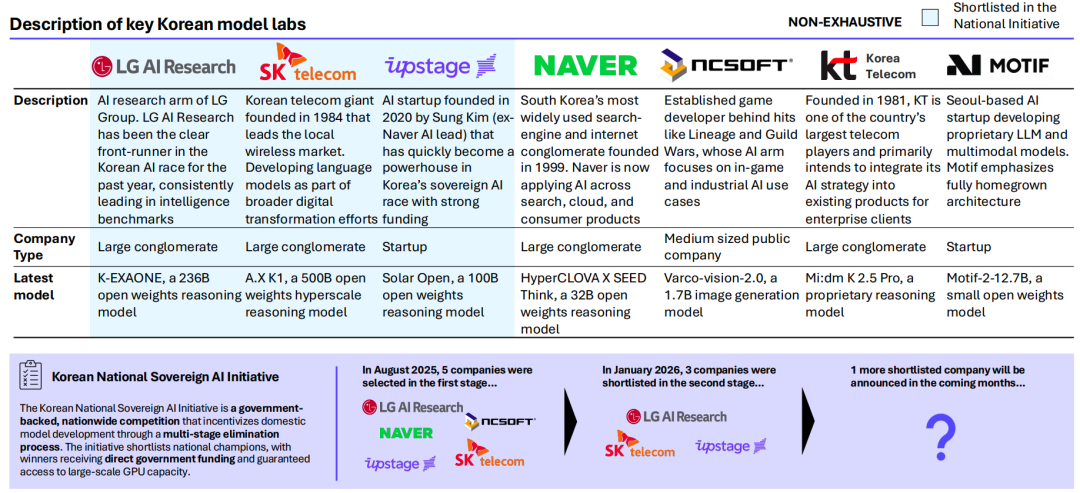 8、韩国政府支持的“国家 AI 计划”已经激活了本土 AI 生态系统,催生出多家接近前沿水平的 AI 实验室。