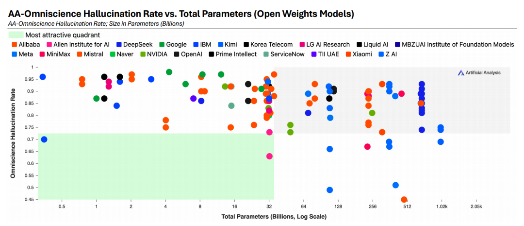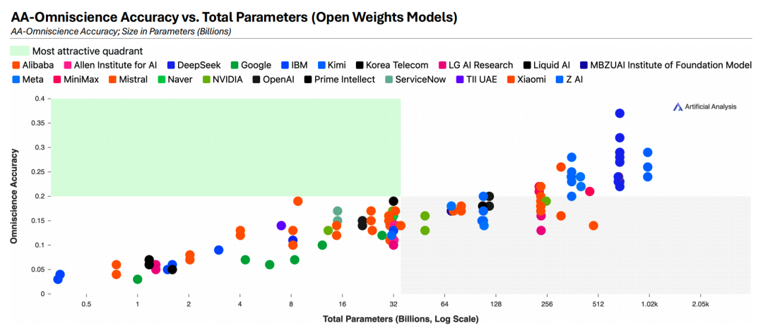 3、模型规模越大,其全知指数评测分数(AA-Omniscience)就越稳定地处于高位。